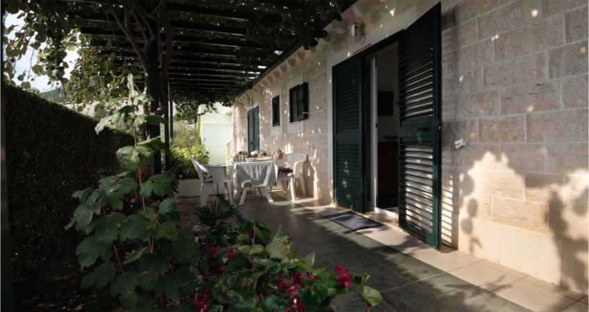 U sjeni izrađenoj od mediteranskog bilja možete uživati pijući domaće vino i okušati se u Vašim kulinarskim umjecima uz roštilj za izradu domaćih specijaliteta ili uz svježu ribu koja se može kupiti u malom gradu.